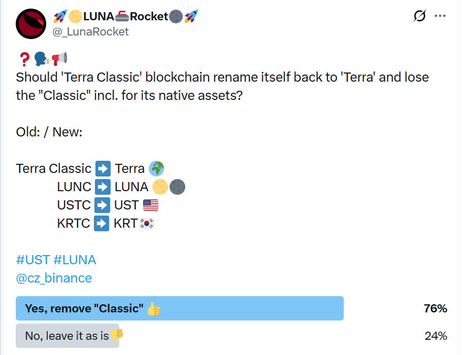 Therefore, the confusion already exists. I’m speculating, but Terra Classic-friendly CEXes could very well accept this re-branding since some of them were never in favor of the fork anyways.